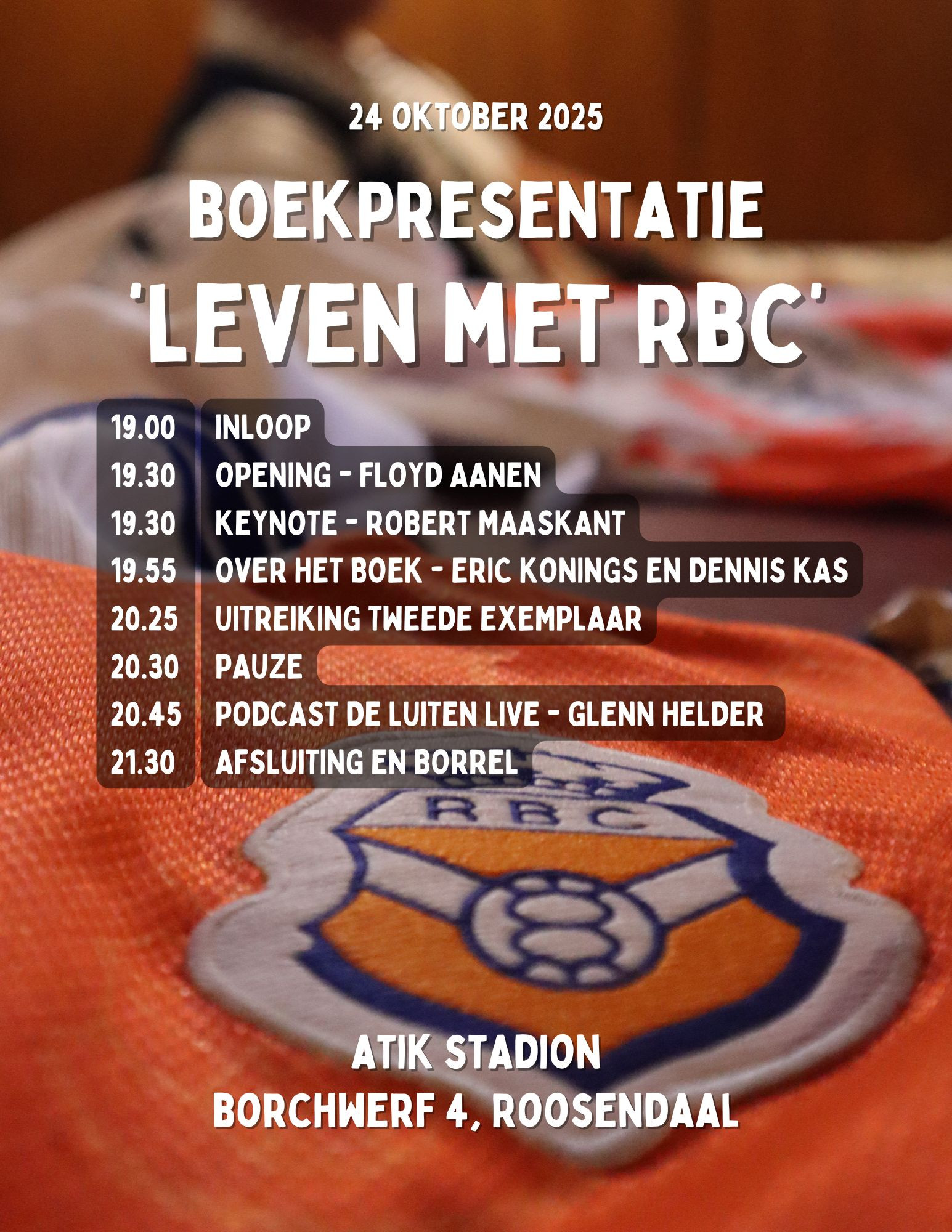 24 oktober aanstaande is de presentatie van het boek 'Leven met RBC', dat verschijnt bij Staantribune, hét magazine over voetbalcultuur. Het boek is geschreven door ras-supporter en vice-voorzitter Eric Konings: " Vriend Jim Holterhuës van Staantribune, hét magazine over voetbalcultuur vroeg of ik nog een bijzonder moment wilde maken van de presentatie. Welnu, reken maar. "Het wordt één grote viering van de RBC-cultuur", antwoordde ik voor ik er erg in had. Op een bruiloft vier je de liefde, op de presentatie van 'Leven met RBC' de clubliefde. We gaan ervoor zorgen dat die een avond lang tegen de plinten omhoog klotst.